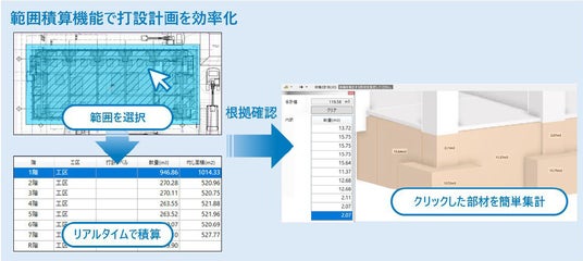 - 工区ごとの打設量をリスト形式で自動集計し、コンクリート数量の計算手間を大幅に軽減。体積・面積の3D計測機能により、数量の根拠を視覚的かつ直感的に確認可能。