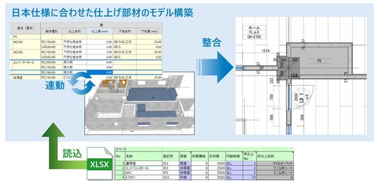 - 設計図書の仕上表をもとにワンタッチで仕上下地をBIMデータとして配置。普段から入力している仕上表Excelデータの有効活用が可能。