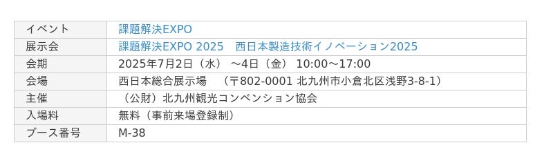 株式会社テクノア(本社:岐阜県岐阜市、代表取締役:山崎 耕治)は、7/2~4 に西日本総合展示場で開催される「課題解決EXPO 2025 西日本製造技術イノベーション2025」に出展いたします。