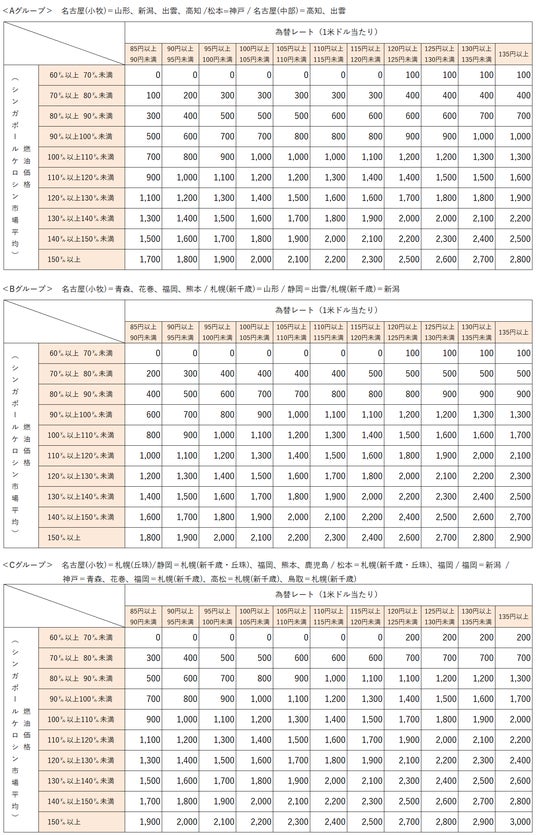 なお、燃油特別付加運賃は、シンガポールケロシン市況価格および為替レートの変動に応じて、1ヶ月毎に見直しております。