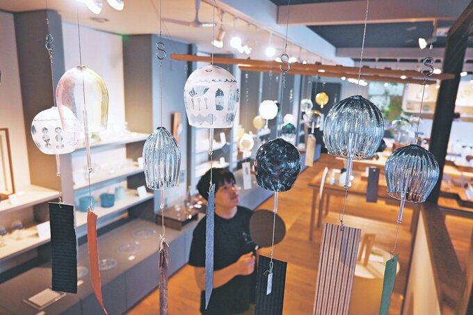 翡翠(ひすい)や碧(あお)など同工房オリジナルの色の多彩な風鈴が吊るされ、うちわをあおいで音色を確かめることもできる。琥珀(こはく)色の風鈴を出展した若色正太さんは「作家としてのこだわりを持ち、個性を出した」と制作意図を話す。