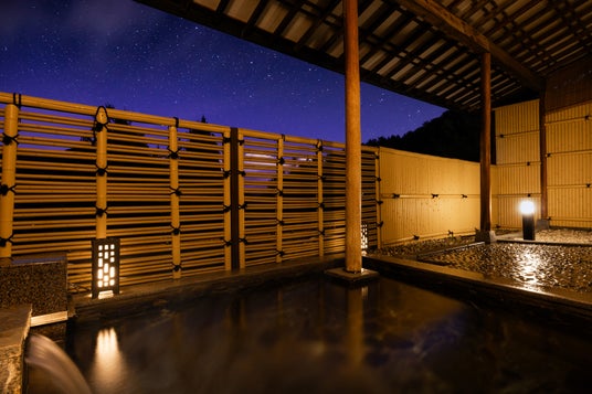 昼神温泉のpH9.7のアルカリ性泉質は「美人の湯」として広く知られ、株式会社ポーラ発行の「美肌温泉証」を取得していることでも、美肌効果の実感に高い評価をいただいております。お客様にご好評いただいている2つの貸切風呂では、プライベートな癒しの時間をご提供いたします。