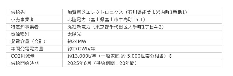 北陸電力株式会社(以下、北陸電力)と丸紅新電力株式会社(以下、丸紅新電力)は、加賀東芝エレクトロニクス株式会社(以下、加賀東芝エレクトロニクス)へ太陽光発電所由来の再生可能エネルギー電力(以下、再エネ電力)の供給を開始しました。