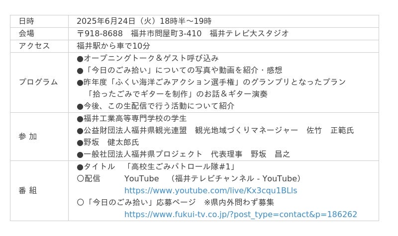 一般社団法人福丼県プロジェクトは、6月24日(火)に「高校生ごみパトロール隊」生配信の2回目を放送いたします。この生配信は、日本財団が推進する海洋ごみ対策プロジェクト「海と日本プロジェクト・CHANGE FOR THE BLUE」の一環で開催するものです。