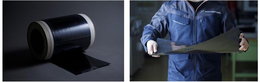 (左)炭素繊維強化熱可塑性樹脂(CFRTP)に高接着性を付与したAPLASシート、(右)フレキシブルなシートで、補強対象に合わせた熱による曲げ加工も可能