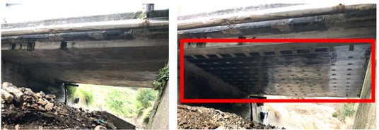 (左)補強工事前の山田橋、(右)APLASシート工法による補強工事後の山田橋。橋軸に対して、水平と直角の2方向の格子状にAPLASシートを貼り付けて補強