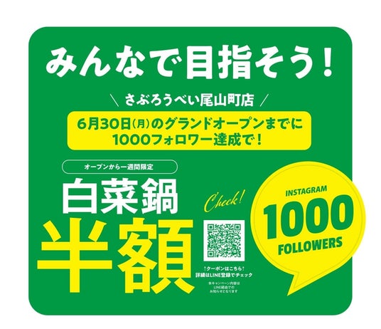 ■尾山町店のインスタグラムのフォロワー数 1,000人達成すると…→とり白菜鍋が半額!!