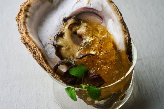 能登産の生の岩牡蠣を使用し、能登のいしるを使用した出汁と、金沢柚子を使ったポン酢ジュレをかけて仕上げました。ジュレには金沢金箔を使用しており、インパクトも抜群です。