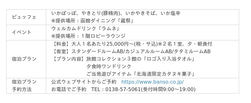 ホテル万惣では、毎年8月1日から開催されている函館港まつりでの定番曲「いか踊り」に登場する「いかぽっぽ」や当館売店での売り上げNo.1となっている「いか塩辛」など、いかづくしのメニューに加え、「やきとり」と呼ぶのに何故か豚肉の串焼き?!な北海道の「やきとり」をご用意。また、ウェルカムドリンクとして夏祭りの定番ドリンク「ラムネ」をご提供いたします。宿泊プランに付帯する「北海道限定カタヌキ菓子」は、クマ、ホタテ、しゃけなど、北海道ならではのモチーフが楽しいアイテムです。