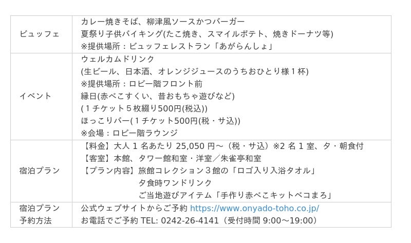 ORIX HOTELS & RESORTSがお届けする「旅館コレクション」ブランドの「函館・湯の川温泉 ホテル万惣」(北海道函館市、以下 ホテル万惣)、「会津・東山温泉 御宿 東鳳」(福島県会津若松市、以下 御宿 東鳳)、「黒部・宇奈月温泉 やまのは」(富山県黒部市、以下 やまのは)は、各地域の夏祭りの味覚が楽しめる合同企画第5弾「祭ばやし鳴り響く、盛夏ローカル旅」を2025年8月9日(土)より開催します。あわせて、本日より宿泊プランの予約受付を開始します。