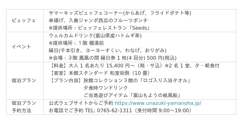 やまのはでは、お子様が大好きなメニューを集めたサマーキッズビュッフェのコーナーが登場。富山の名物「入善ジャンボ西瓜」を使用したフルーツポンチは、見てビックリ!食べておいしい!期間限定メニュー。館内では夏祭りの定番ヨーヨーすくいや千本引き、わなげなどの縁日や、家族みんなで遊べるボードゲームコーナーも設置いたします。宿泊プランに付帯する紙風船は、むかし各地を行商した富山の薬売りが、薬のおまけに子供に配ったという、富山の歴史を感じるおもちゃです。