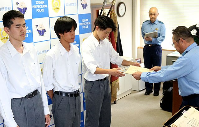 高岡署は19日、用水路に転落した70代男性を救助したとして、福岡高校の生徒と教諭の計5人に署長感謝状を贈った。