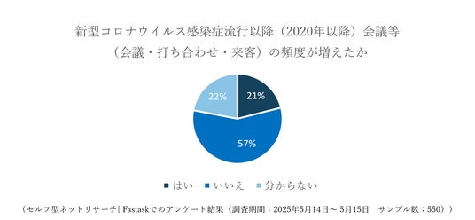 出社とリモートを組み合わせたハイブリッドワークが一般化する中、気軽に遠隔地と会議ができることで、その開催頻度が増加しています。当社の行ったアンケート調査(*)によると、新型コロナウイルス感染症流行以降(2020年以降)会議等(会議・打ち合わせ・来客)の頻度が増えたと回答したのは21%と5人に1人以上は会議の開催頻度の増加を感じていることが明らかとなりました。