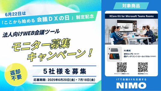 ITで会議DXを支援するナイスモバイル株式会社(本社:長野県松本市、代表取締役社長:高学軍)は、2025年3月31日(月)に一般社団法人日本記念日協会(事務局:長野県佐久市、代表理事:加藤清史)より6月22日を「ここから始める会議DXの日」として正式認定を受けました。これを記念して、 2025年6月20日(金)より、会議DXを推進できるMAXHUB「XCore Kit for Microsoft Teams Rooms」を無料で5社に提供するモニターキャンペーンを開催いたします。