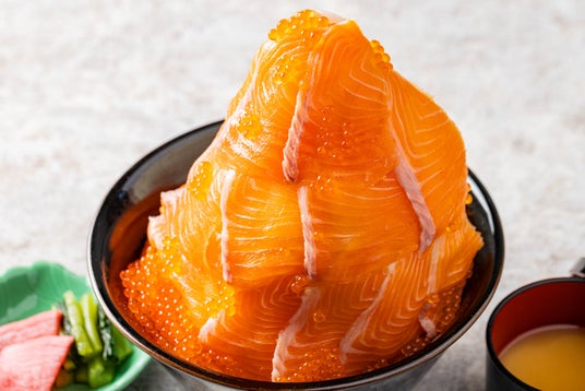 約500gのご飯に、約300gのたっぷりの信州サーモンを盛り付け、鱒の子イクラをアクセントに添えました。