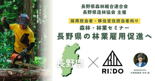 日本初の林業特化の専門求人サイトを運営する株式会社RINDO(本社:長野県伊那市、代表取締役:中村 就、以下、当社)は、長野県森林組合連合会・長野県造林協会が主催する採用担当者・移住定住担当者へ向けた『森林・林業セミナー』に、登壇いたしますことをお知らせします。