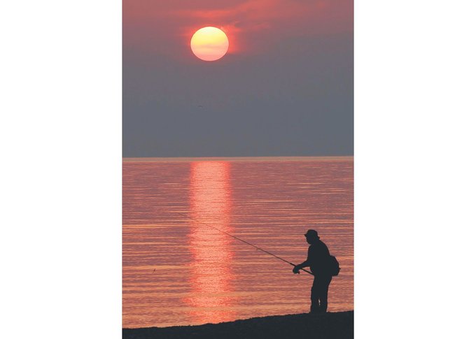 辺りを美しく照らし、釣りざおを伸ばす人や海辺を散歩する人のシルエットが浮かび上がった。