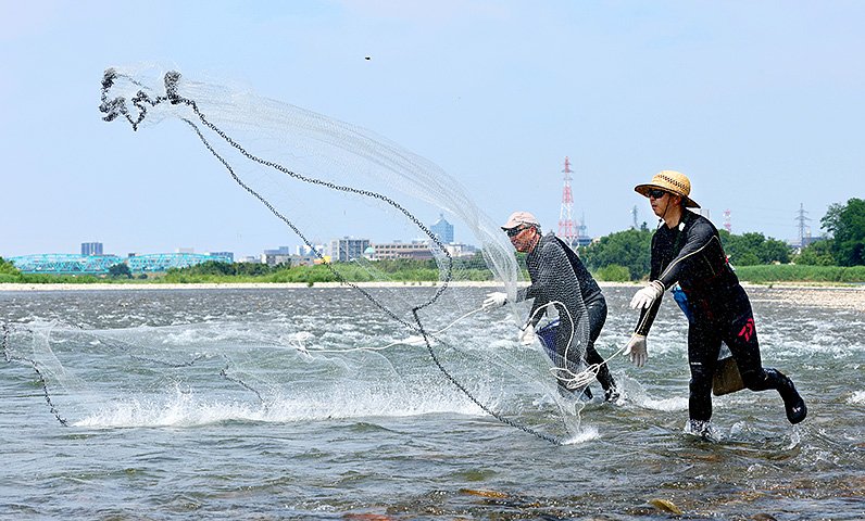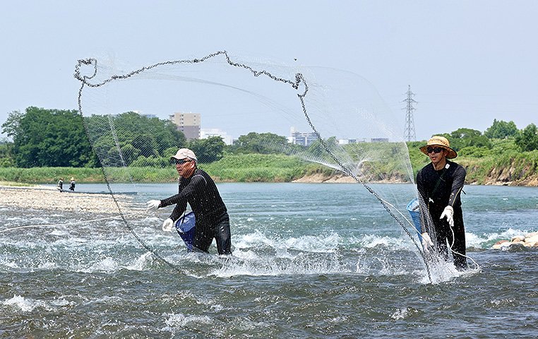 アユの網漁が21日正午、県内の河川で解禁された。同日は一年で最も昼が長い夏至。富山市の神通川では青空の下、愛好者が思い思いのポイントをめがけて何度も網を投げ入れていた。