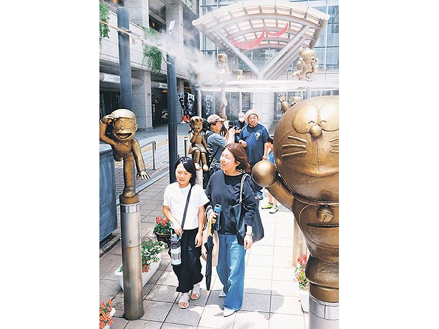 高岡駅前にあるウイング・ウイング高岡広場では、訪れた人たちが「ドラえもんの散歩道」に設置されたミストシャワーを浴びて涼を感じていた。