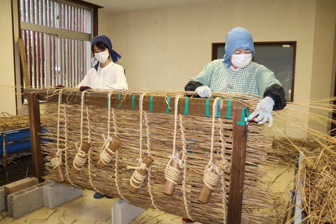 平地域の7人が技を継承しているが、生産が追いつかなくなったため、夏から秋にかけて行う作業を前倒しし、今月中旬から取りかかった。23日は、川崎眞千子さん(71)=相倉=と浦田夏子さん(52)=篭渡=が、180センチ四方の受注品を1枚編み上げた。2013年に福井県から移り住み、技を受け継ぐ浦田さんは「縄の縛り方やススキの組み合わせ方などに知恵が詰まっていて楽しい」と話した。