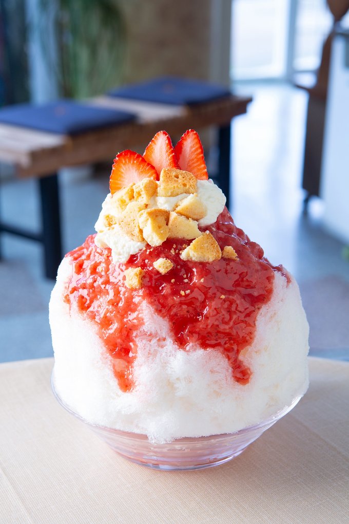 「いちごレアチーズタルト」はふわふわの氷に、爽やかな風味の自家製いちごシロップやチーズクリーム、クッキーなどをトッピング。氷の中にもいちごやクッキーを忍ばせており、食べ進めるごとに味が変化する。今後は、氷見市特産の稲積梅や灘浦みかんを使った「地元大好きシリーズ」も登場する予定だ。