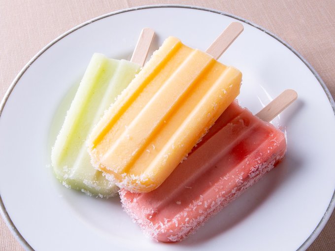 「アイスキャンデー」(各220円) 左から「青りんご」、「みかん」、「いちご」。くずを使っているため溶けにくい。当たりが出たらもう1本もらえる