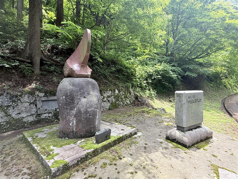 今も県内に名残がある。魚津市の松倉城跡(標高約430㍍)へ続く林道途中には「郷義弘顕彰碑」が設けられている。車1台が走るのがやっとという道路を通り抜けると、ひっそりとたたずみ、歳月の風に耐えている。