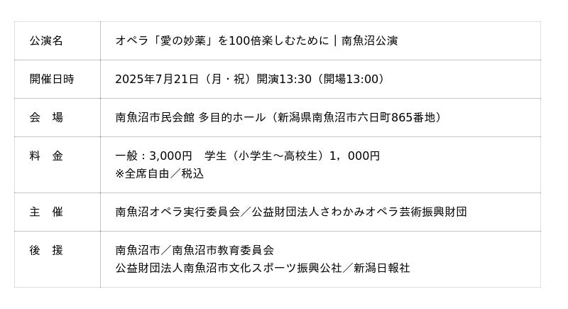 2025年10月に南魚沼市で上演される「オペラ『愛の妙薬』南魚沼公演」に先立ち、プレコンサート「オペラ『愛の妙薬』を100倍楽しむために|南魚沼公演」が7月21日(月・祝)に南魚沼市民会館で開催されます。