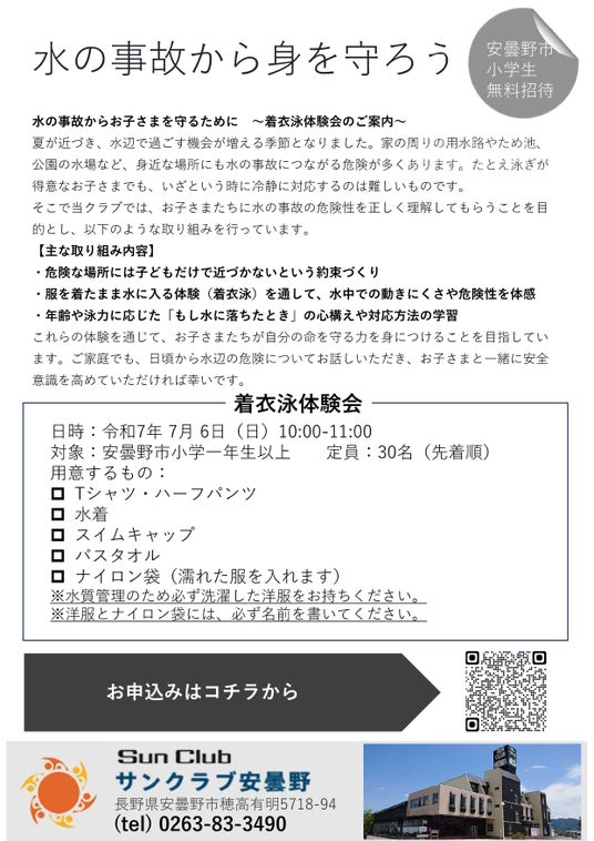 安曇野市にあるサンクラブ安曇野では、夏を前に水難事故防止を目的とした「着衣泳体験授業」を実施いたします。