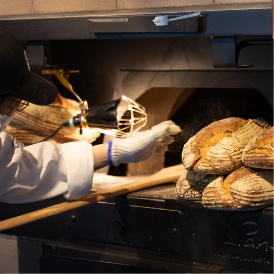 新設した工房には、200年以上の歴史を持つフランスLe Panyol社製の薪窯を導入。南仏の耐火レンガで構成された窯は、均一かつ力強く放熱するのが特徴です。そこに軽井沢産の唐松と楢木の2種類を使い、薪の炎で500℃まで一気に熱を上げていきます。薪窯でのパン作りは職人の技と感覚に委ねられます。焼き加減やタイミングを調整しながら、薪窯ならではの豊かな香りと食感のパンを作り出します。