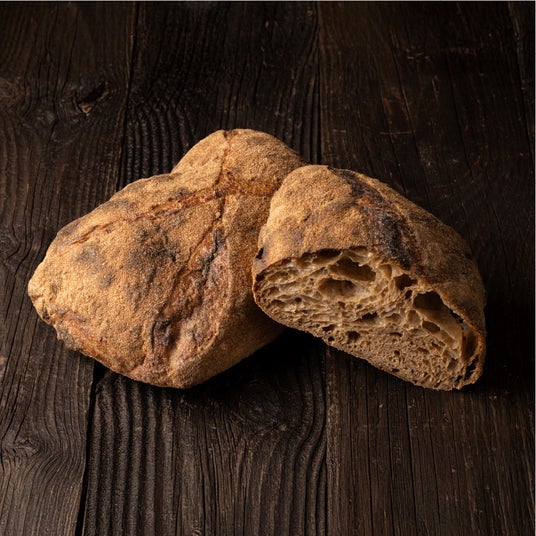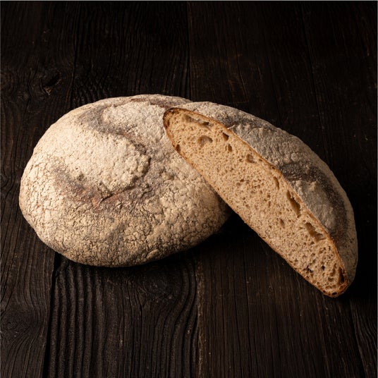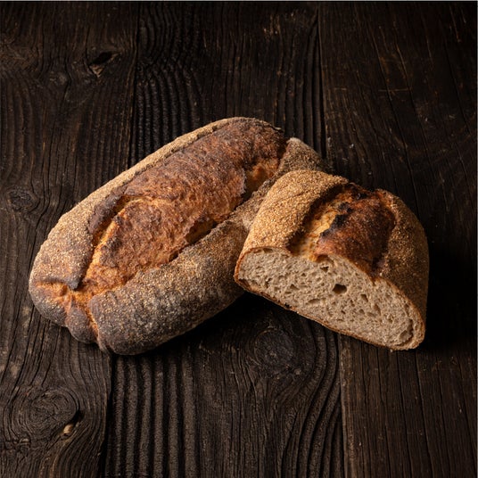 北海道産「キタノカオリ」と無農薬のライ麦を使用。りんごとレーズンの自家製サワー種で長時間発酵した生地を薪窯でじっくりと焼き上げることで、力強い酸味と小麦の甘みが重なる味わいが特徴的なパンです。