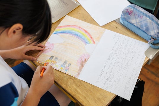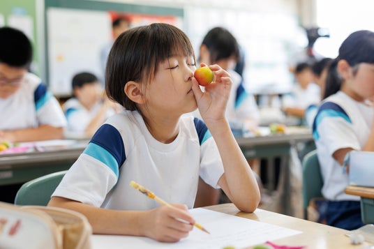 梅の里小学校での授業は、2023年ぶり2度目の実施。特産品である梅を町民一体となって盛り上げるための町の条例「梅育(うめいく)」に基づき、町役場の農林水産課や地元の生産者の協力のもと実現しました。授業で用いたのは、皇室献上品種として知られる「紅映」の青梅。「風に揺れるチューリップの景色が浮かんだ」「夕焼け色が見えた」「コロコロという音が聞こえた」など、梅の果実の香りから、子どもたちの豊かな創造性が教室中に広がりました。