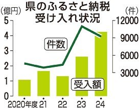24年度の県への寄付は、23年度から件数が16%減ったものの金額は大きく伸びた。税務課によると、1件当たりの金額が大きい大口の寄付が増えた。寄付金は基金に積み立て、寄付者の希望に応じた事業に活用している。