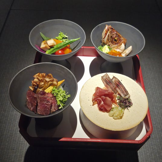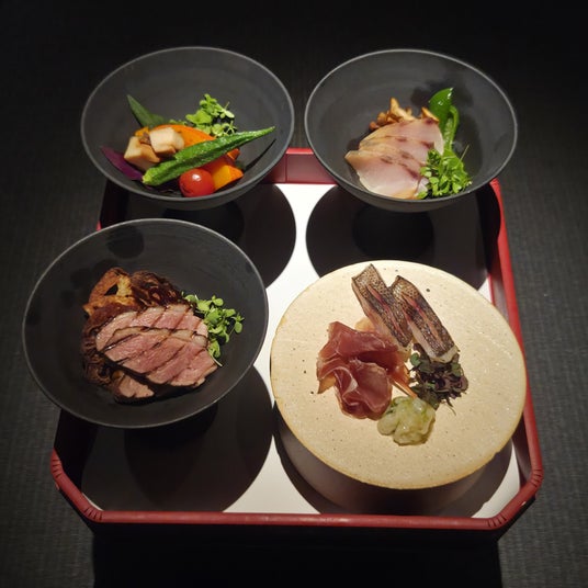 ■メニュー barrierでは、三方(さんぼう)をお膳として利用し、岡持ち(おかもち)に収められた三つのお椀料理に、サイフォンで抽出された一番出汁を注ぎます。 これにより、一杯のお出汁がお客様の食体験に奥深さと芳醇さを加えます。 barrierは、伝統的な日本料理のエッセンスを守りつつも、現代的なアプローチで新たな魅力を引き出すことを目指しています。 漆黒の空間で五感を研ぎ澄ませて、出汁に合う料理をお楽しみください。