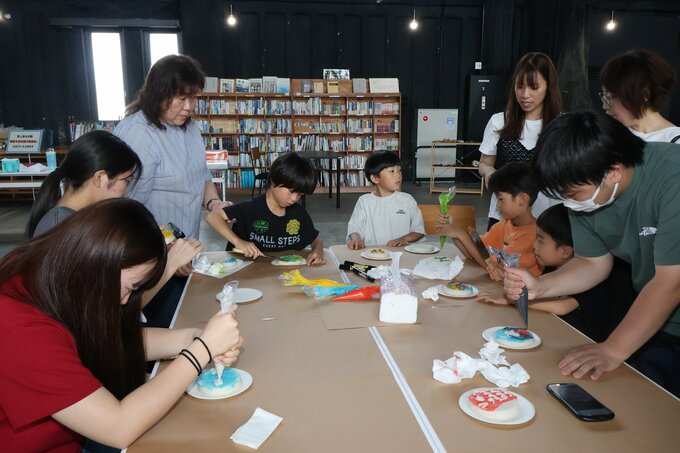 同市窪にある「加納かまぼこ店」の加納豊さん(76)と進一さん(50)親子が講師を務めた。参加者は、円形のかまぼこ台に赤色や青色など計6色の着色すり身を絞り出し、思い思いに絵を描いた。