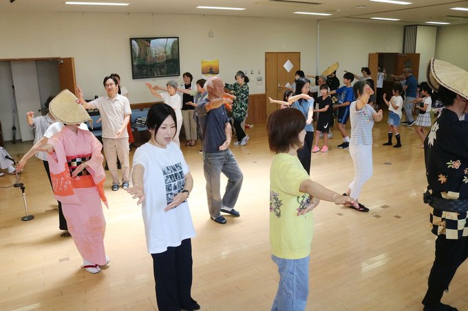 踊りの体験コーナーでは、メンバーの川井直紀さんと布村智子さんから、種まきや稲刈りといった農作業の動きを取り入れた「豊年踊り」の所作を教わった。指先まで神経を行き届かせるよう意識しながら、繰り返し練習。三味線や太鼓、胡弓(こきゅう)の生演奏に合わせ、全員で輪になって踊った。楽器に触れる時間もあった。