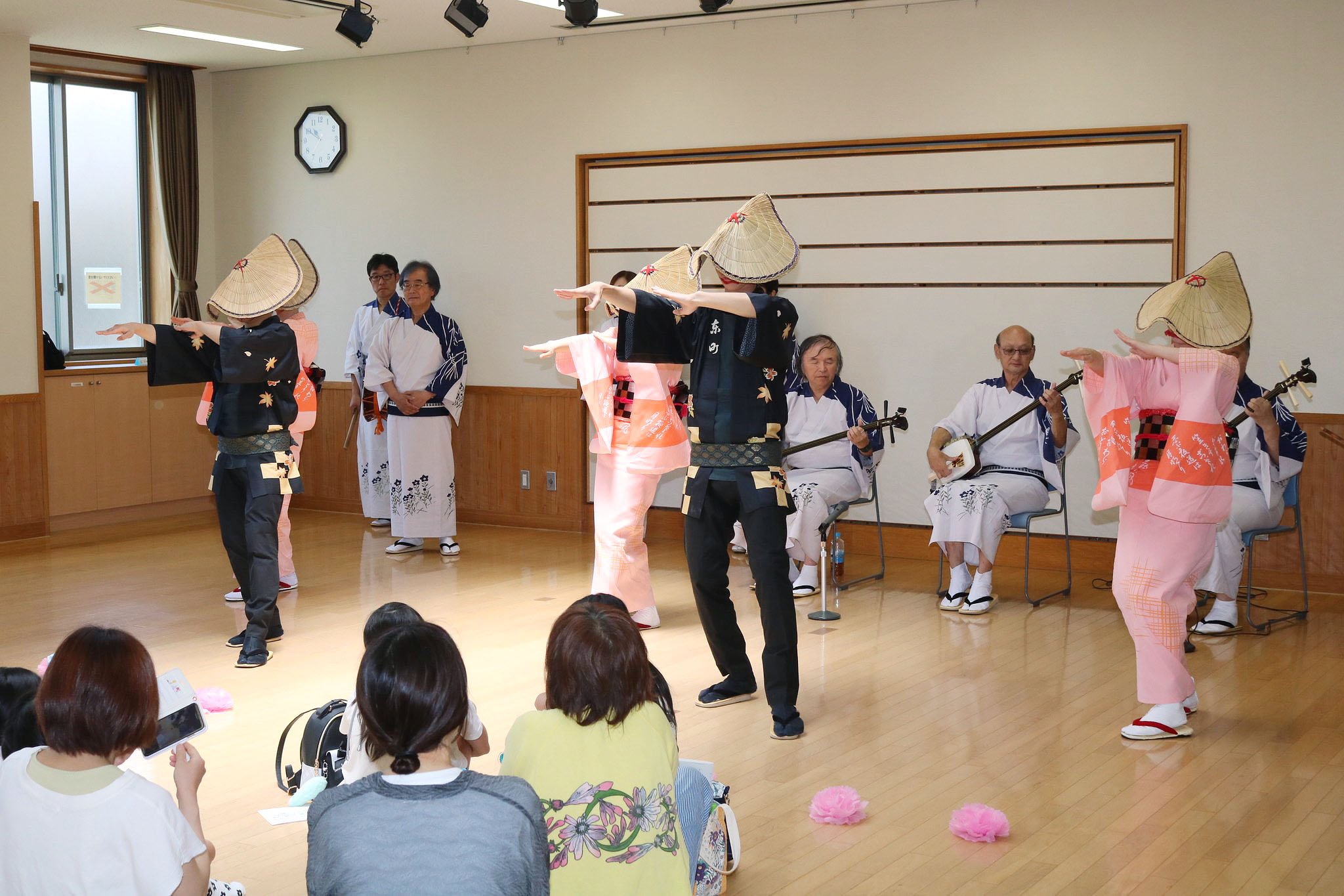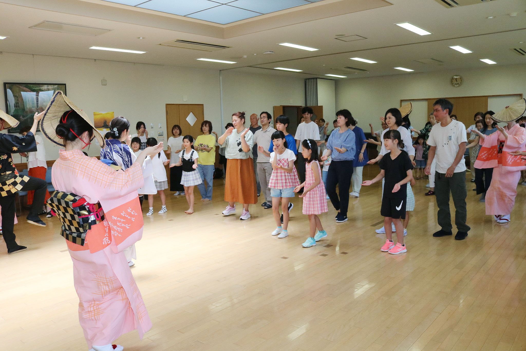 越中八尾おわらを楽しむ会が29日、富山県の富山市堀川公民館で開かれた。子どもからお年寄りまで幅広い世代の住民約70人が、おわらの鑑賞と体験を通じ、富山を代表する伝統文化の情緒に触れた。
