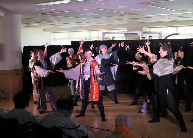 富山県南砺市井波の南砺市民病院で29日、医療従事者らでつくる団体によるミュージカル公演が行われた。患者やその家族、職員らに癒やしや笑顔を届けようと企画。観客約60人は歌や踊りを楽しみながら、他人を思いやる力強いメッセージに触れた。