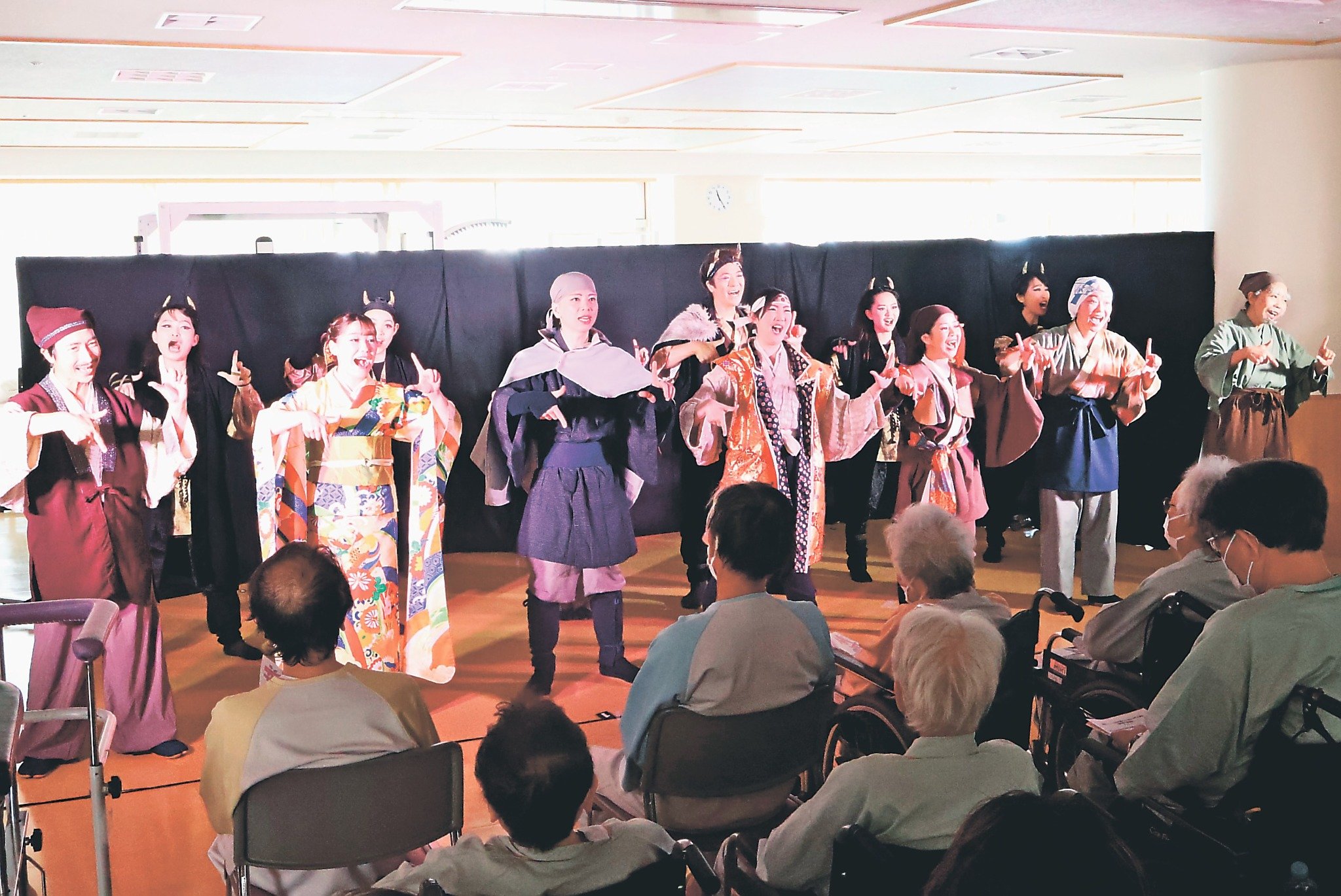演目は「桃四郎の鬼退治」。病院や福祉施設でミュージカルを上演する団体「キャトル・リーフ」(千葉県)のオリジナル脚本で、かつて伏江さんが同団体に所属した縁から提供を受けた。親交のある東京の劇団「ダイナモス」のメンバーと共に計17人で演じた。