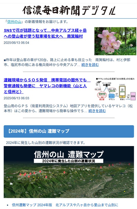 信濃毎日新聞デジタルでは、長野県内の山岳に関する新しい記事をお知らせする「信州の山 新着情報メール」を登録無料でお送りしています。安全な登山につながる遭難や火山の噴火警戒レベルの情報、山小屋や登山道の状況などを送信します。見ごろを迎えた高山植物の写真、各地で検討、導入が進む任意の登山協力金といったテーマ、身近な里山の情報など、信州の山に関する多様なニュースを見逃すことなく読むことができます。