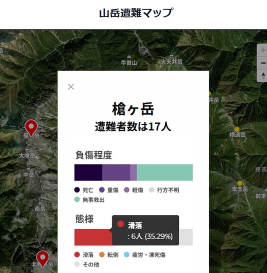 地図上のマーカーやポイントをクリックすると、山名、遭難者数、負傷程度などが表示されます。