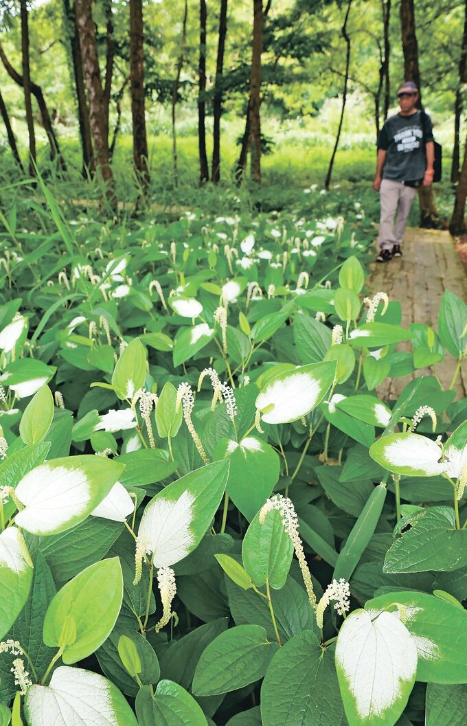 湿地に生えるドクダミ科の多年草で、半夏生の頃に花を咲かせることや、葉の半分が白く変色することが名前の由来とされる。見頃は今月中旬まで。