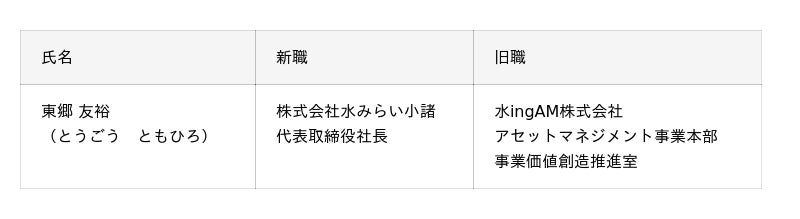 水ing株式会社(社長:安田真規、本社:東京都港区)は、2025年6月24日に開催された定時株主総会および取締役会において、小諸市、水ingAM株式会社、第一環境株式会社が出資する株式会社水みらい小諸の代表取締役社長交代を決議しましたのでお知らせします。