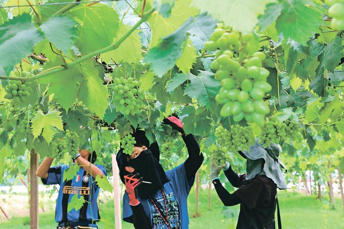 8月上旬から始まるブドウの収穫を前に、富山県富山市鶚谷(みさごだに)のやまふじぶどう園で、余分な粒を摘み取る摘粒(てきりゅう)作業が進んでいる。