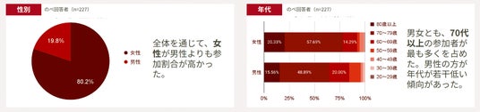 本取組の一環として一緒に笑って語り合う時間を提供する交流型イベント「笑語ひろば」を2024年10月より毎月開催してきました。本イベントは2024年10月~2025年3月までに13回開催し、のべ256名が参加。参加者は70代以上の高齢者が中心で、約7割が珠洲市・輪島市出身。女性や独居世帯の割合がやや高い傾向がありました。