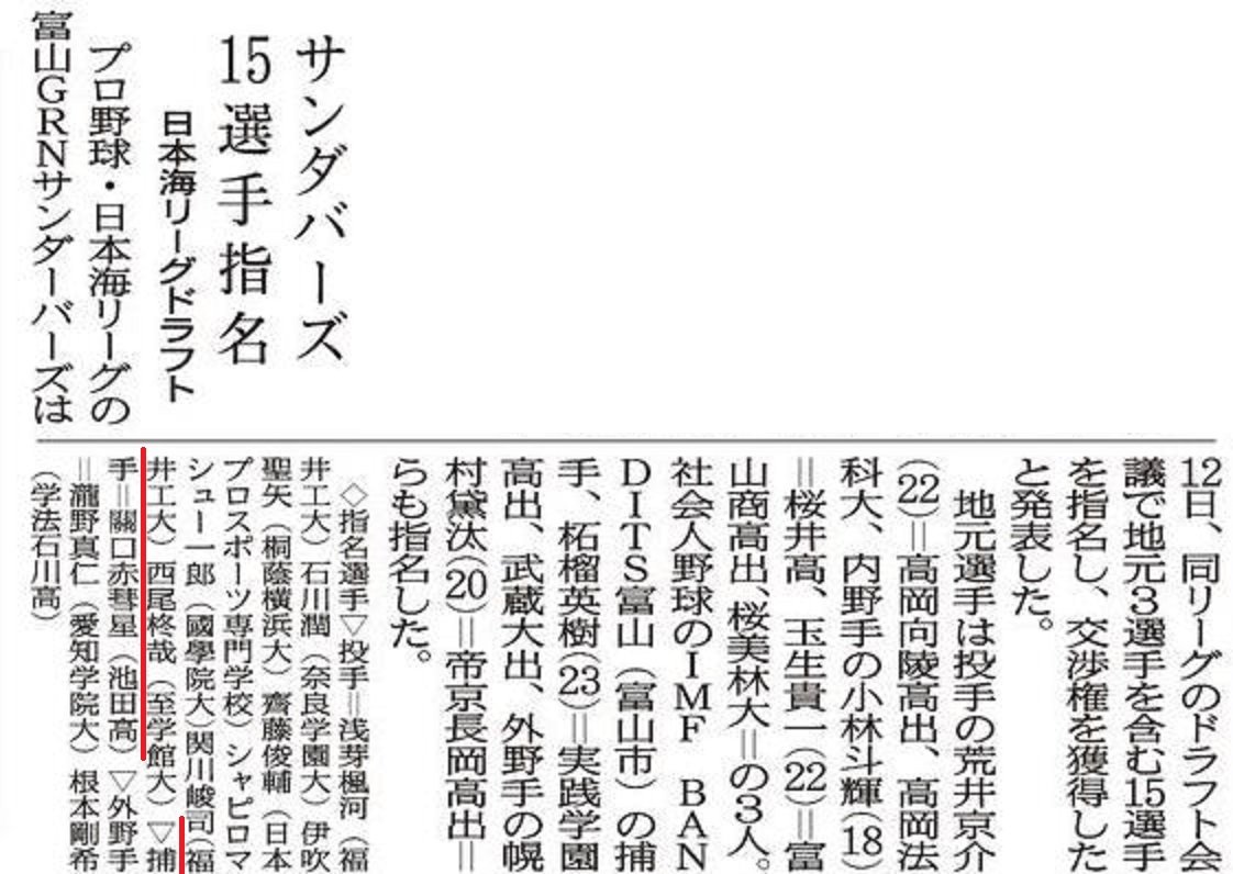 昨秋のドラフト会議の結果を伝える11月13日付の北日本新聞朝刊。捕手に「關口赤彗星」の名前がある