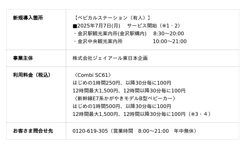 ○この度、公益社団法人 石川県観光連盟と連携し、金沢駅構内「金沢駅観光案内所」と香林坊・長町武家屋敷跡など観光名所にアクセスのよい「金沢中央観光案内所」のインフォメーションで7月7日よりベビーカーのレンタルサービスを開始いたします。