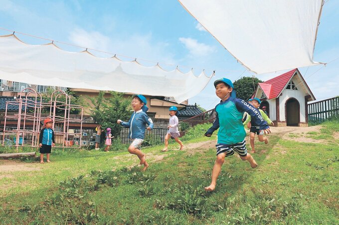 4日は、遮光ネットの下で園児が元気よく駆け回ったり、水遊びを楽しんだりしていた。
