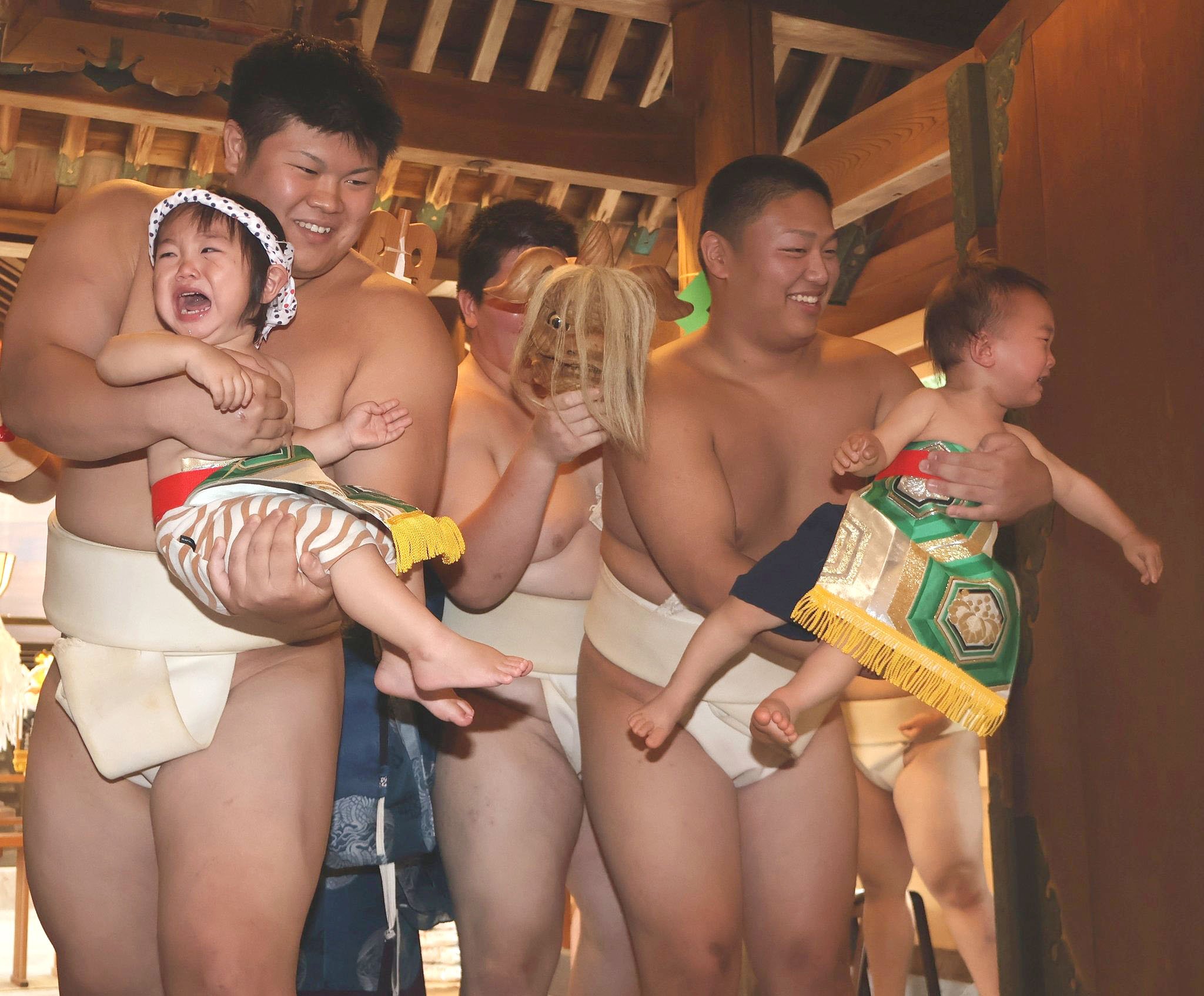 生後6カ月~1歳11カ月ごろを対象とし、本年度は171人が出場。まわし姿の赤ちゃんは高岡向陵高校(同市石瀬)の相撲部員に抱っこされ、社殿の特設土俵に上がった。神職の合図で部員たちが顔を近づけたり驚かせたりすると大きな声で泣いた。笑みを浮かべる赤ちゃんもいた。