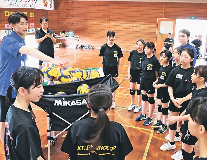 バレーボールのSVリーグは5日、富山県氷見市の宮田小学校で、元プロ選手2人によるバレーボール教室を開き、市内の3クラブに通う児童34人が技術を学んだ。